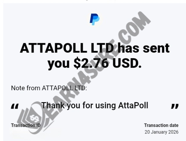 Yes, AttaPoll does pay! I’ve received payments several times. The platform processes payout requests quickly, usually within 5 minutes of requesting. Below is a screenshot of my most recent PayPal payment from AttaPoll.