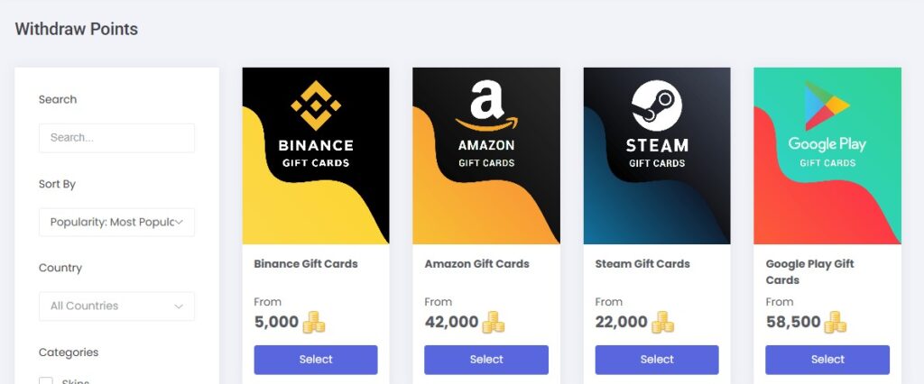 - Good payout options – Offers PayPal cash, crypto via Binance gift cards, gift cards, game codes, and Steam skins.