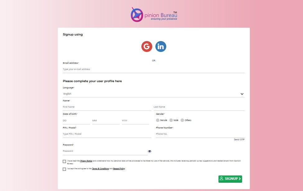 Getting started on Opinion Bureau is quick and easy. You just need to sign up using your email, Google, or LinkedIn account. The registration process takes only a few minutes.