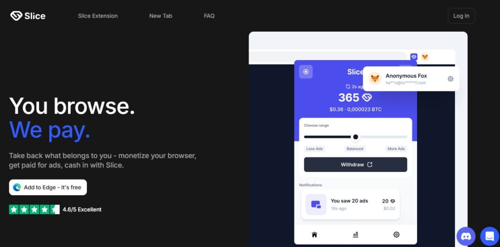 Slice is a simple browser extension that turns your regular browsing time into earning time. Once you install it on your favorite browser—like Chrome, Edge, Firefox, or Safari—it displays small, non-intrusive ads as you surf the web. In return, Slice shares a portion of its ad revenue with you.