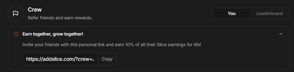 Slice also offers a referral program called “Crew” that lets you earn extra passive income on top of your regular earnings. You can invite friends, family, or anyone to join Slice using your unique referral link.